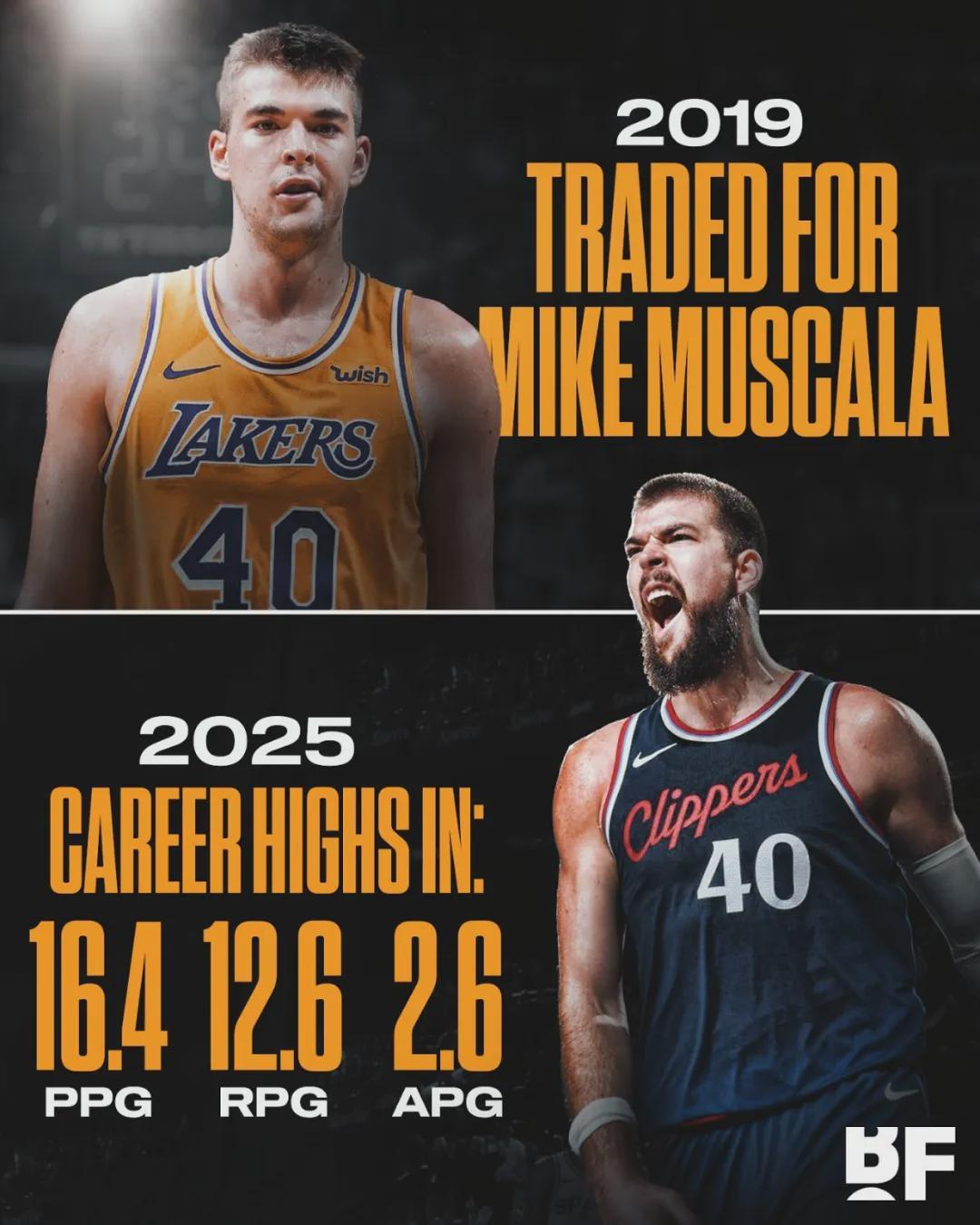 祖巴茨出生于1997年3月18日,2016年第32顺位被湖人选中。10年NBA生涯,他一直在洛杉矶打球。2019年2月,湖人把祖巴茨和迈克尔-比斯利送到快船,2换1交易得到穆斯卡拉。结果穆斯卡拉在湖人只打了17场比赛就离队了!